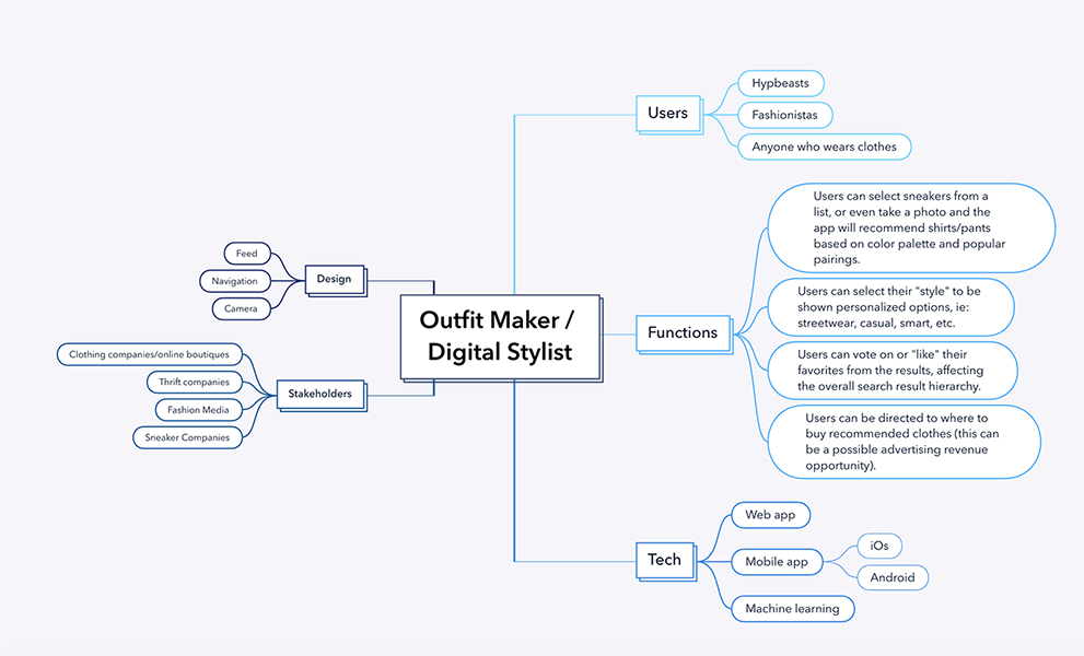 First, I started with a mind map laying out the basic idea of the product and its features. We then formed a team to conduct market research and create a market matrix. Of the 15 products researched at the time, only two had a feature that allows the user to scan an article of clothing and find matching or similar items.